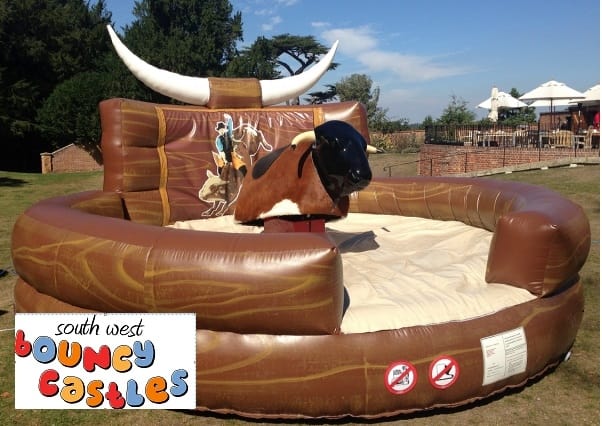 Our Rodeo Bull price includes 3 hours with one of our friendly staff operating. We will travel further through Devon and Cornwall than our post code checker show with the bull so please call if it flags as area not covered. This top of the range unit comes with a large timer and 3 fixed speed programmes to keep things fair if you choose to run your day as a competition. The inflatable base is walled for extra safety. We are pleased to be one of only a few companies offering a rodeo bull in North Devon and North Cornwall.